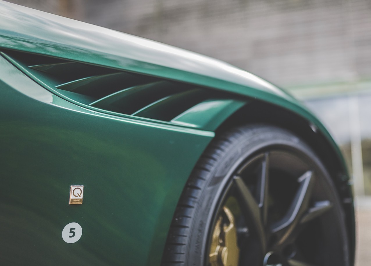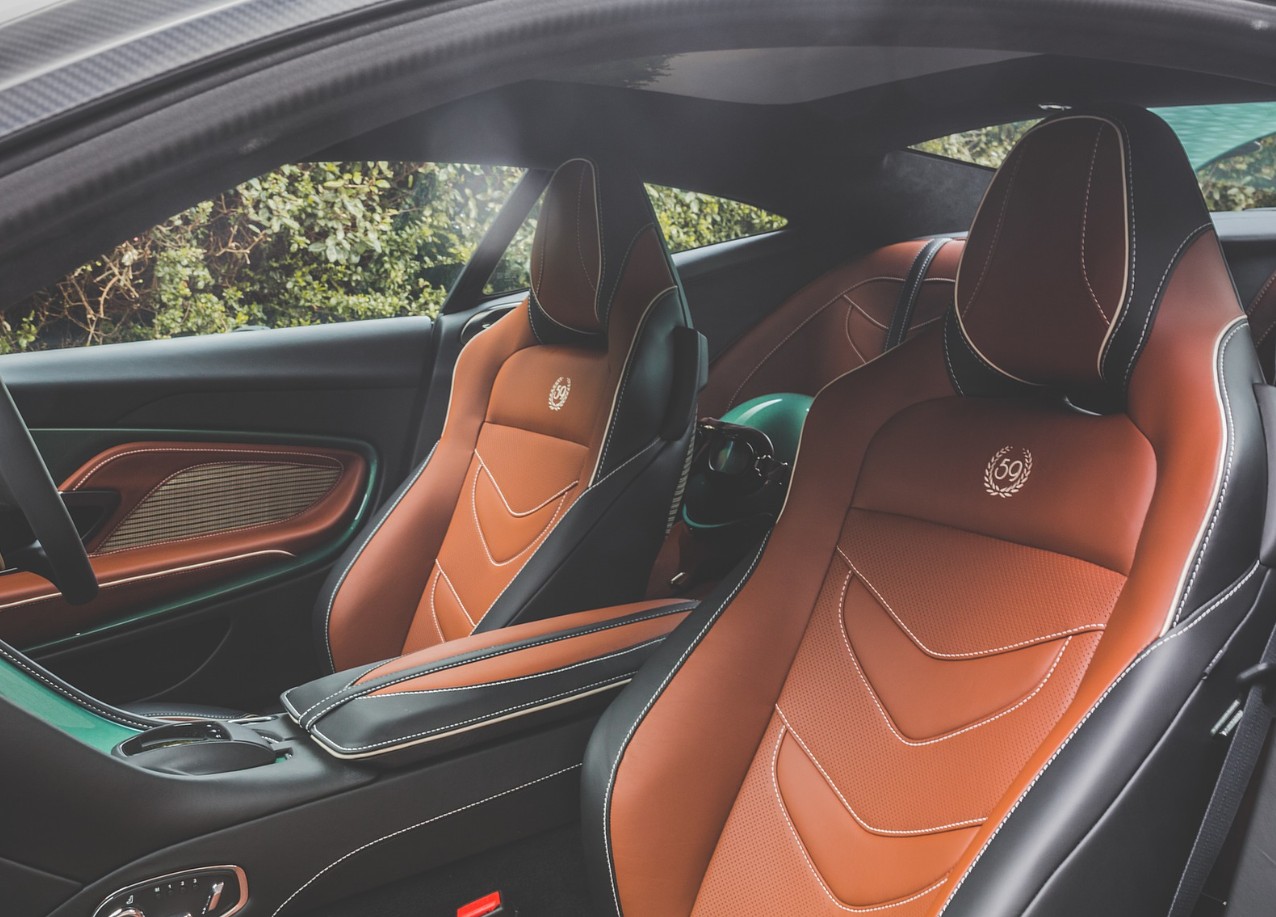 The cabin’s interior narrates the tradition of motorsport and workmanship. Green Alcantara inlays complement the chestnut-hued Bridge of Weir leather, evoking the cockpit of the DBR1. The model has a unique identification thanks to the delicate needlework marking “59” put into each seat independently. For a distinctive finish, Aston Martin’s artisans used carbon fiber inlays throughout the center console and dashboard, along with bronze accents. The degree of hand-finished finishing highlights this vehicle’s uniqueness and makes sure that each interior component feels customized for the driver.