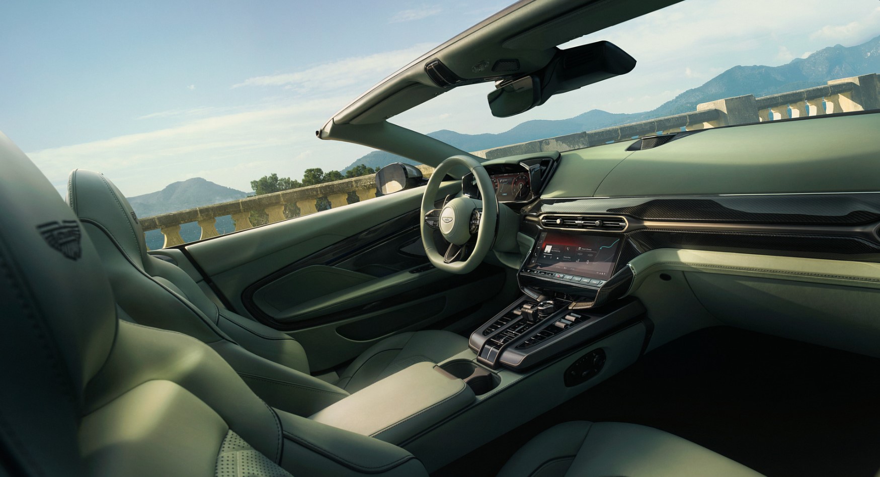 Haptic feedback controls are housed in a redesigned flat-bottom steering wheel that is finished in carbon and leather. A 12.5-inch digital driver display behind it provides performance readouts that may be customized. Everything from driving modes to ambient lighting is controlled by the central touchscreen, which runs the proprietary Aston operating system and enables complete OTA upgrades.