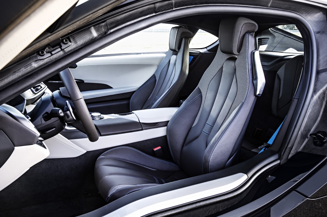The exterior of the 2026 BMW i8 Coupe is a masterpiece of futuristic style and practicality. New air curtains and intakes precisely channel airflow, and a floating roofline produces a striking appearance. Slim OLED taillights that wrap around the body dominate the back, emphasizing the coupe’s broad stance. Optional carbon-fiber wheels, which come in 20- or 21-inch sizes, reduce weight and give off a look reminiscent of a racetrack. The i8 Coupe maintains its unique appearance on the road thanks to premium paint jobs like Liquid Blue 2.0 and Frozen Arctic Silver.