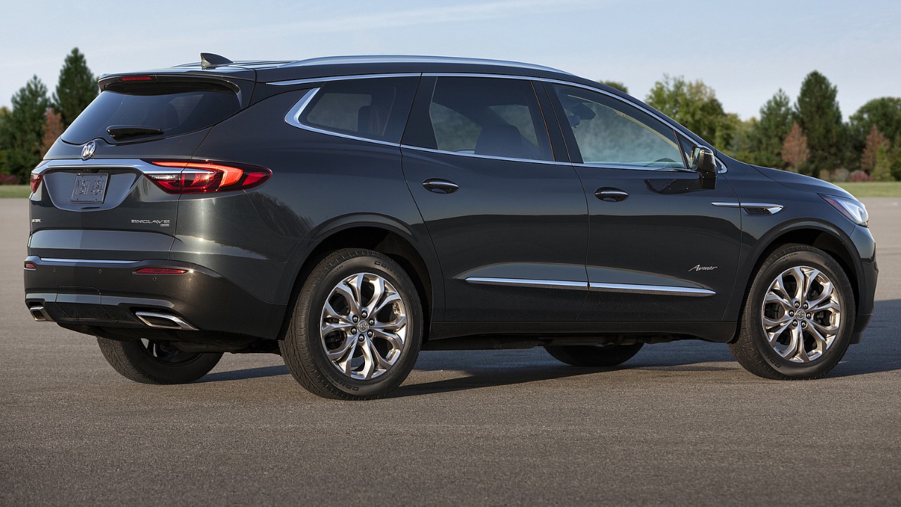 The Enclave Avenir maintains its flowing, smooth look from the side, but its edges are sharpened by altered proportions and sharper body lines. It has a more athletic stance than the previous version since it sits lower, broader, and a little longer. The Avenir’s standard 21-inch Pearl Nickel alloys are unique, and the blacked-out B- and C-pillars give the SUV a floating roof that adds to its upscale appearance. It is easily identifiable because to the distinctive Avenir badging on the front doors and the understated chrome accents around the lower rocker panels.