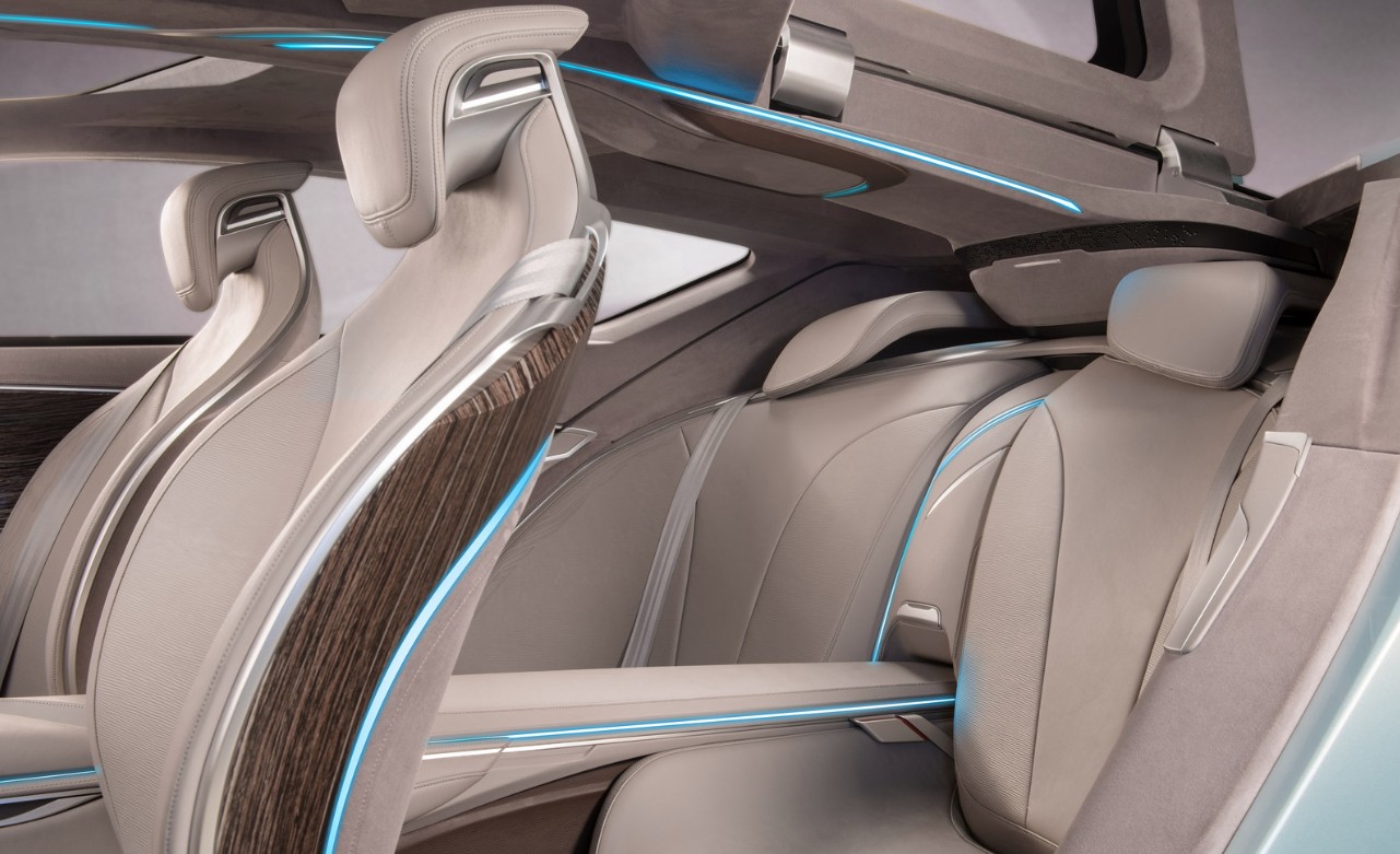 The Riviera’s distinctive nighttime character is created by a full-width light bar that is flawlessly blended with thin, blade-like LED headlights that stretch the top borders of the front. Active aerodynamic panels below regulate airflow according to driving mode and speed, improving economy and performance. The Riviera’s body is smooth and sleek; no conventional mirrors nor door handles are visible. Rather, Buick has embraced concealed touch-entry panels and digital side cams. From the slim, coupe-like rear deck to the tapering roofline, every element of the design is engineered for beauty and airflow.