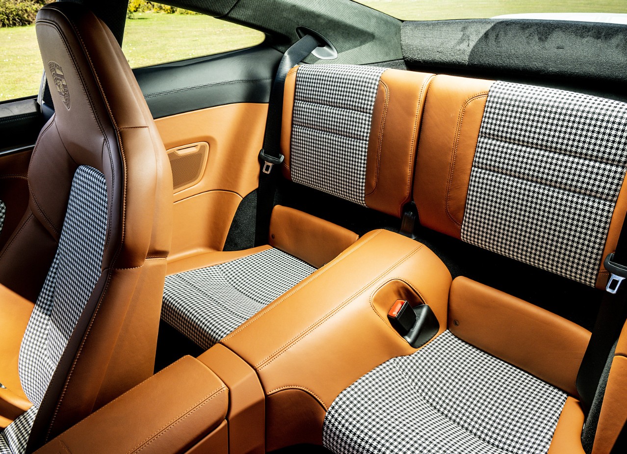 Entering the cabin, Porsche successfully combines elegance and tradition. Semi-aniline leather in distinctive two-tone combinations, like Classic Cognac and Black, is a highlight of the Sport Classic. Houndstooth seat inserts, a throwback to the original 911s, are back in a contemporary version that combines comfort and nostalgia. In order to further emphasize the performance philosophy and make the cabin feel upscale and special, Porsche also incorporates carbon-fiber elements on the center console and dashboard.