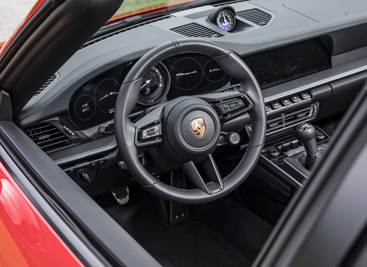 The cabin’s interior is a luxurious fusion of contemporary technology and heritage references. With a vintage analog tachometer in the middle and programmable screens on either side, the typical five-gauge cluster has been transformed into a largely digital arrangement. With its 12.3-inch high-resolution screen, Porsche’s most recent infotainment system easily connects to Android Auto, Apple CarPlay, and Porsche Connect services. Customers looking for a custom finish can now choose between semi-aniline leather, Race-Tex suede, and natural wood accents. With ideal ergonomics and comfort for daily use, the cabin layout maintains its driver-centric philosophy.