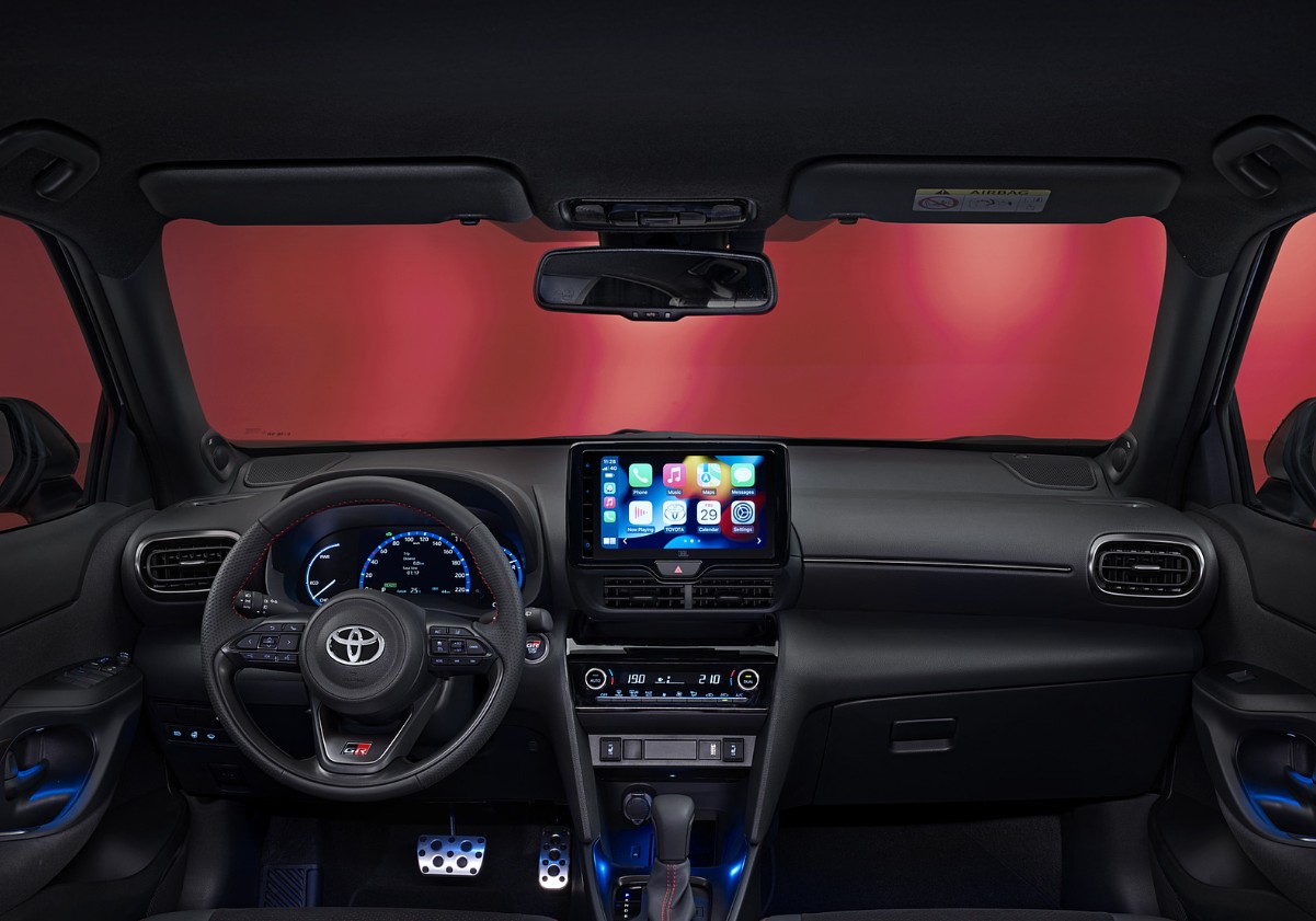 The fenders and tailgate are subtly adorned with GR badging, and the dual exhaust finishers are housed in a gloss black rear diffuser. A contrast black roof is standard on most trims, providing a visual clue to the car’s sportier ambitions, while side skirts run the length of the lower body to further accentuate the GR character. For the GR Sport version, Toyota provides a distinctive color scheme that includes the striking “Emotional Red II,” “Precious Metal,” and “Platinum White Pearl,” all of which contrast with the black exterior trim.