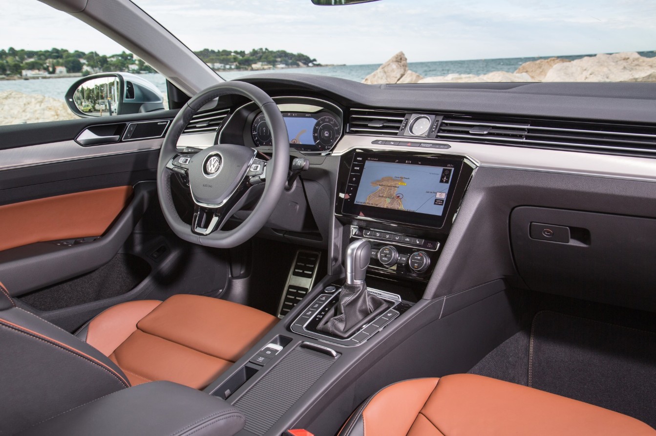 New high-end finishes including Crystal Graphite Metallic, Aurora Blue, and Solar Copper add to the Arteon’s exterior color scheme and draw attention to the vehicle’s sculpted features. It emphasizes its grand touring nature with wheel options ranging from 20-inch turbine-style rims to 18-inch multi-spoke alloys. The Elegance trim emphasizes chrome elements and understated sophistication, while the R-Line look trim adds aggressive bumpers, gloss black accents, and distinctive badging. Volkswagen’s quest for aesthetic harmony and aerodynamic purity is evident in every external component.