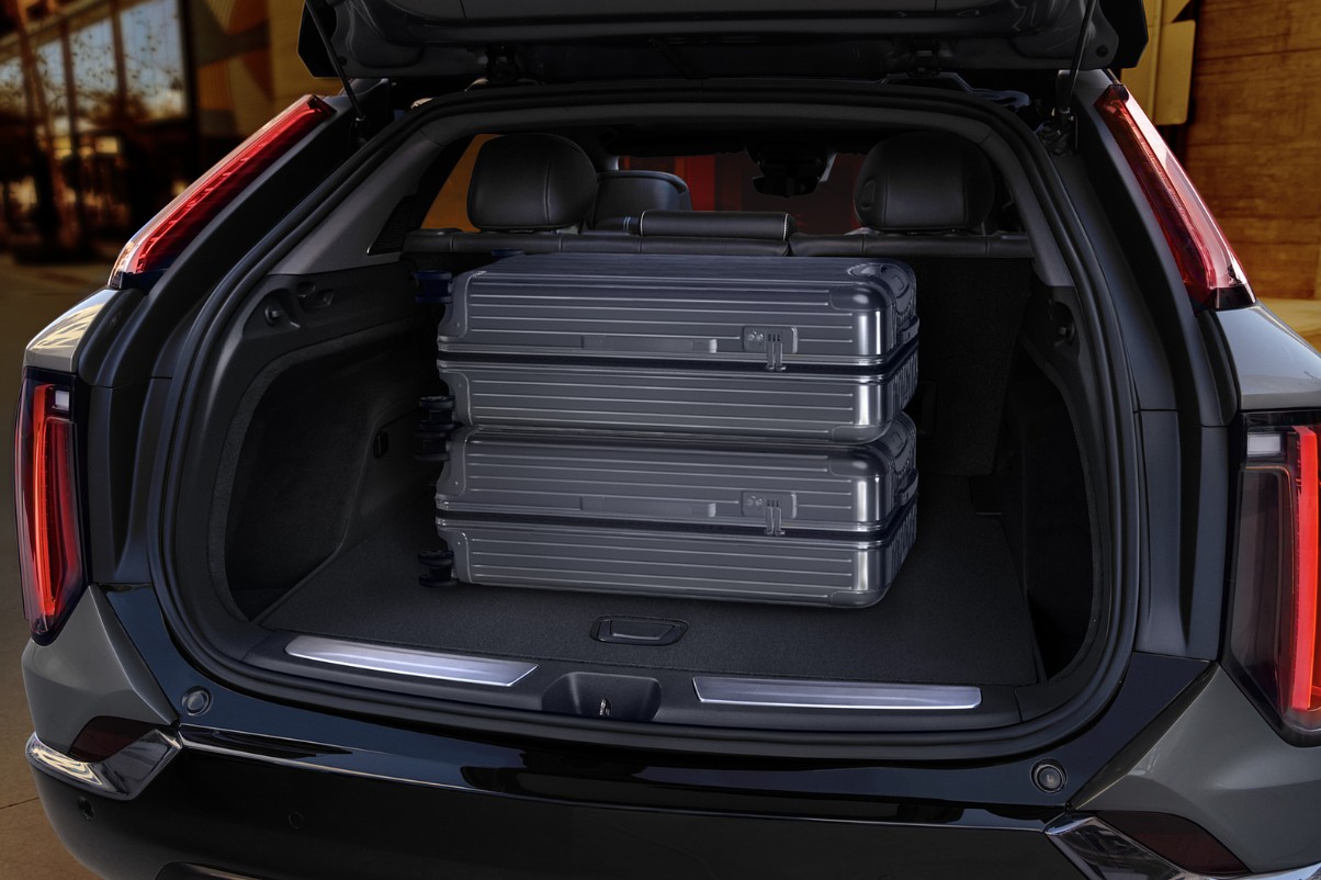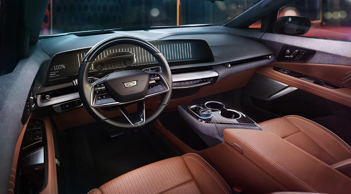 Sustainability and elegance are key factors in seating. Cadillac’s new “Green Luxe” interior materials include recycled micro-suede and leather substitutes made from eucalyptus. The front seats provide memory settings, heating, ventilation, massaging, and eighteen-way adjustment. Not overlooked are the rear passengers, who also enjoy heated seats, a retractable center armrest with USB-C outlets and wireless charging ports, reclining backrests, and their own touchscreen temperature settings. The EV chassis makes the floor totally flat, increasing the interior’s space.