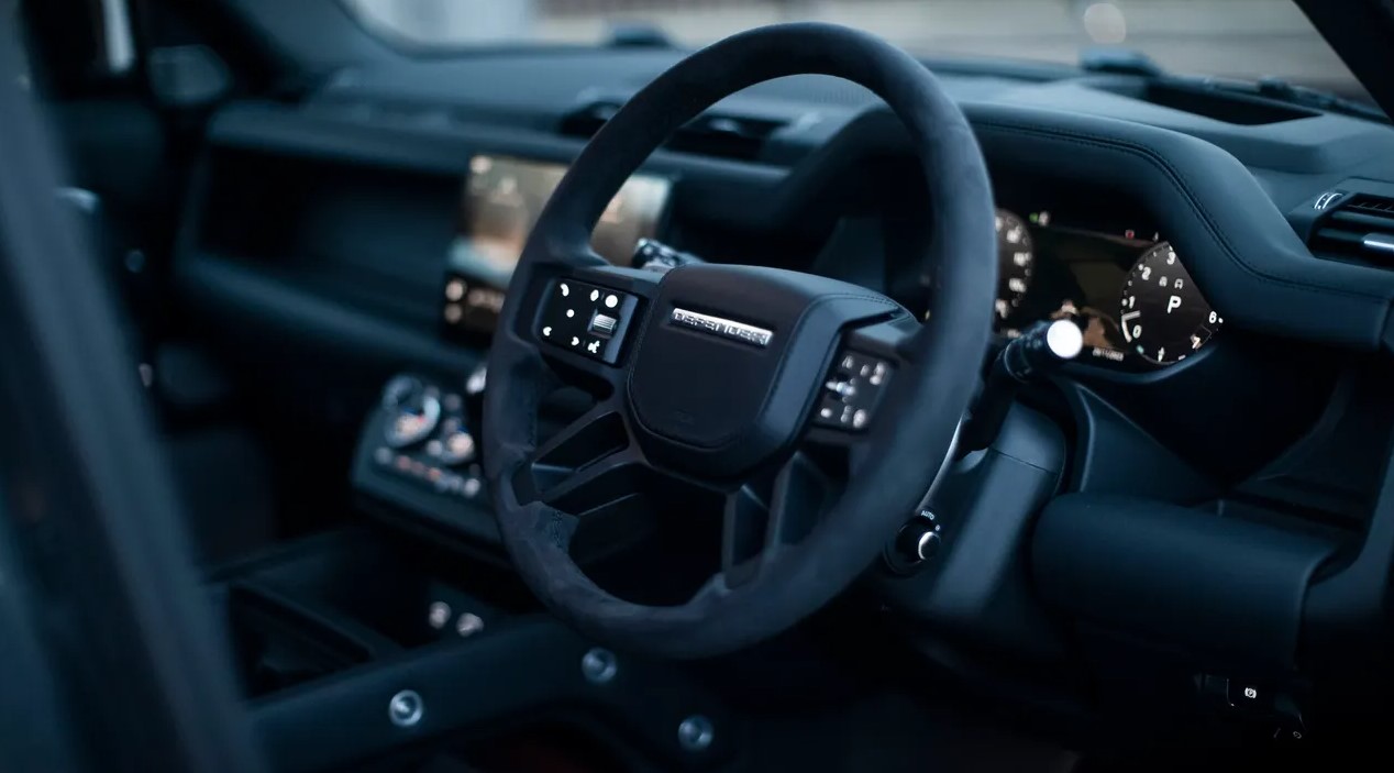 The Defender 130 emphasizes utility and tradition in the back by keeping its iconic side-hinged tailgate and rear-mounted spare wheel. Adaptive lighting technology, which modifies intensity according to conditions, is now incorporated into the taillight clusters. In addition, the 130 has new underbody cameras, a hands-free tailgate, and power-folding side steps for smoother maneuvering on uneven roads or confined parking spots. Every external feature, from the integrated tow hooks with an 8,200-pound towing capacity to the flat door handles, symbolizes durability and purpose. Land Rover has created a car that looks just as good on city streets as it does on mountain routes.