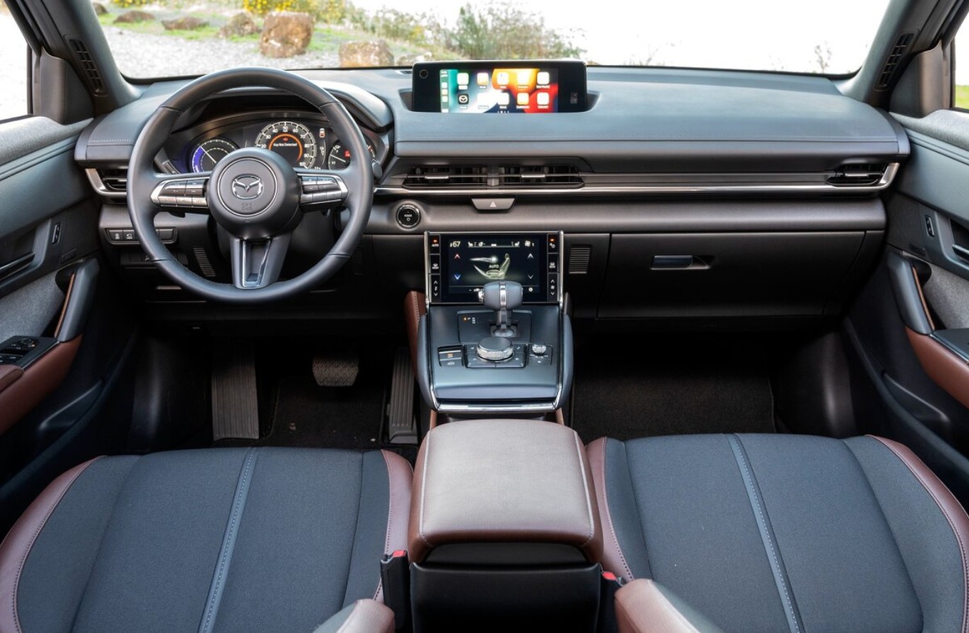 The cabin undergoes a substantial transformation within. Mazda maintains its commitment to sustainable materials while improving design and quality. Premium leather substitutes and recyclable materials provide durability and refinement, while natural cork trim makes a comeback with better finishing. With a larger touch-sensitive interface and quicker reaction times, the floating center console is still a distinguishing feature.