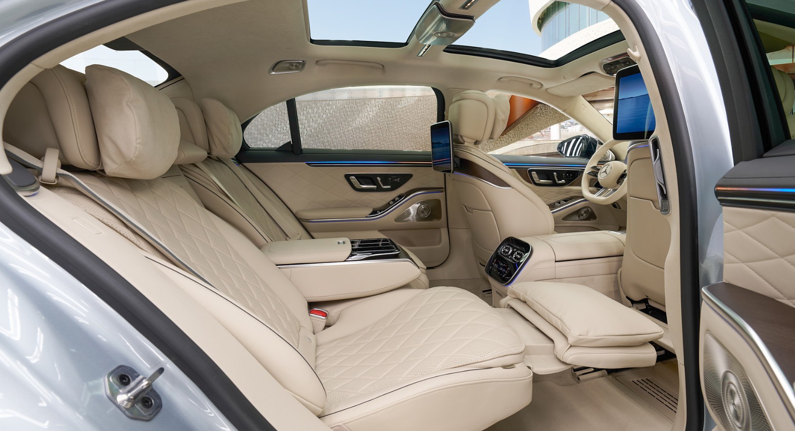 Smoother body surface and flush door handles that maximize airflow and minimize wind resistance are seen along the side profile. Both performance and appearance are improved by new wheel designs that range in size from 19 to 22 inches. Updated LED taillight signatures on the back end emphasize the car’s superior width and stability by extending further across the trunk lid. Additionally, Mercedes offers AMG-line style kits and premium paint finishes that let customers customize their S-Class to their own preferences.